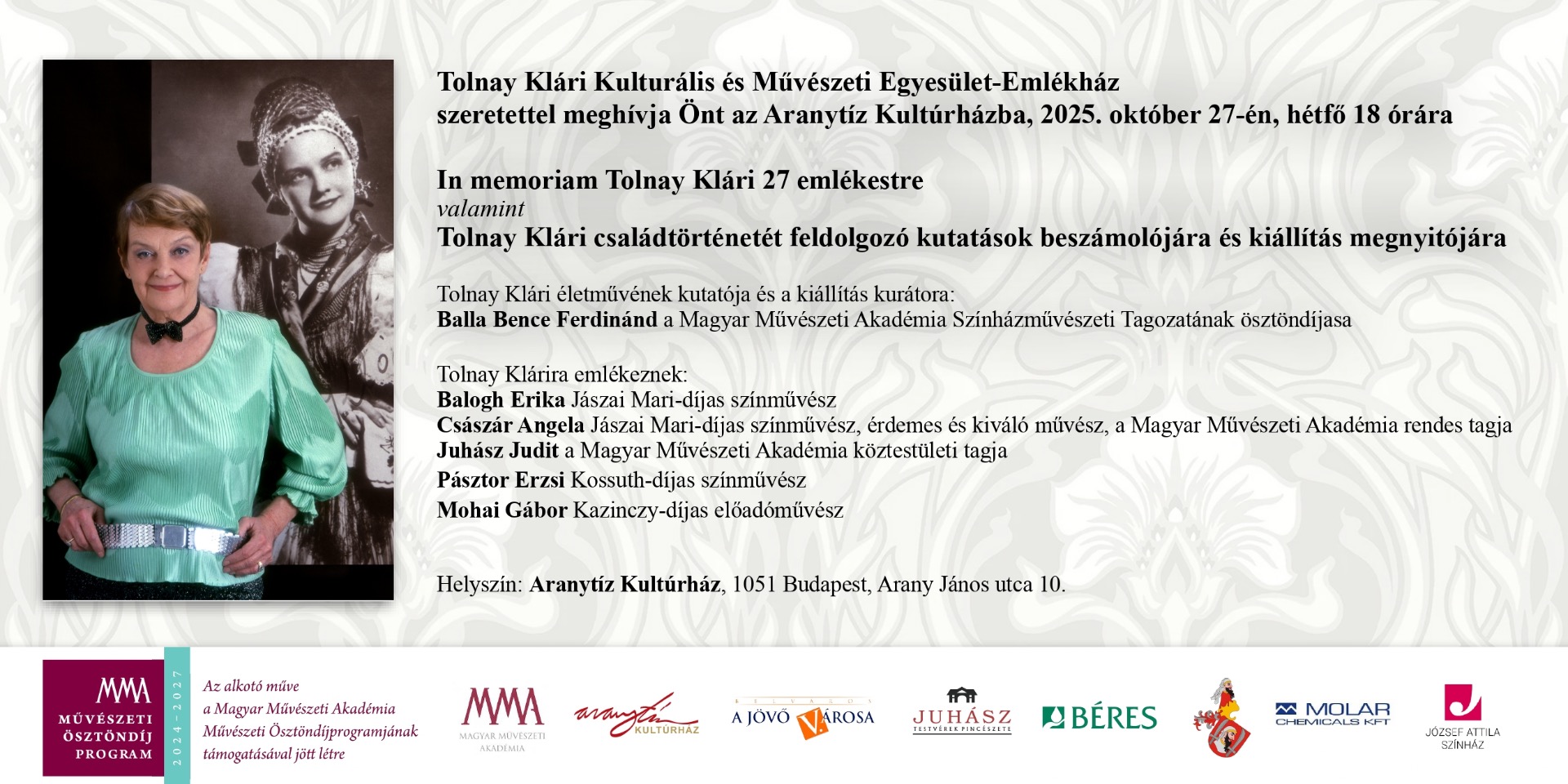 A Tolnay Klári Emlékház szeretettel meghívja Önt 2025. október 27-én, hétfő 18 órára